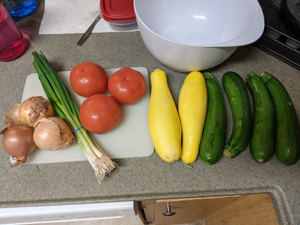 I needed 1 pound of both zucchini and yellow squash (aka summer squash), 1.5 pounds of tomatoes, some scallions (aka green onions) and actual onions.