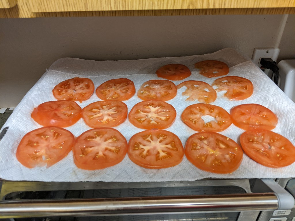 Sliced the tomatoes, sprinkled them with 1/2 teaspoon of salt, and left them on a paper towel covered cookie sheet for about 25 minutes.