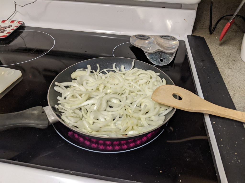 Halved and sliced the onions thin, and sauteed them with a tablespoon of oil until they caramelized, about 20-25 minutes. This step was easier than I expected it to be, and I still burned a few of the onions. If I make this again, I’m going to make sure that I am stirring more frequently early on in the simmering.