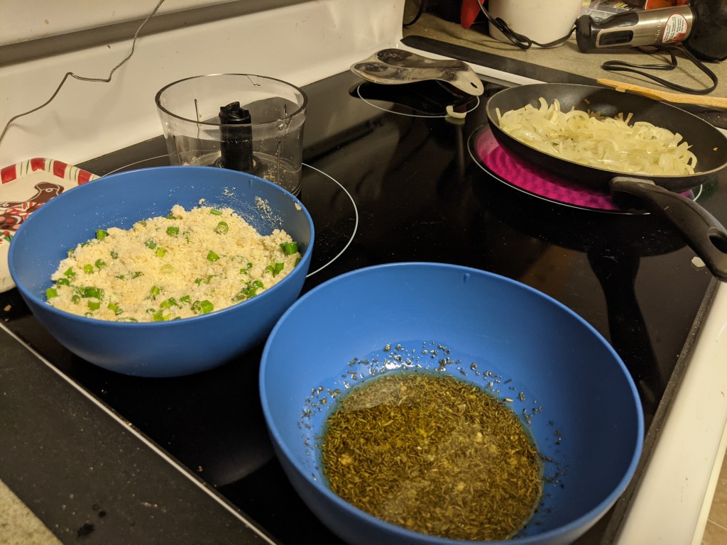 I used a hand mixer to turn a thick slice of hearty white bread into crumbs and mixed it with a tablespoon of oil, a cup of grated Parmesan, and three scallions thinly sliced. Then I made the 3Tbsp/garlic/thyme/pepper mixture that would need to get mixed in with the veggies during assembly (note that I was still doing the onions while putting these two bowls together.
