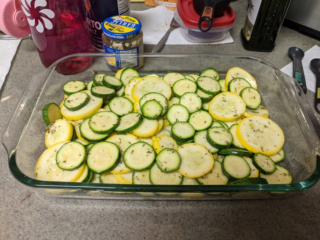 Sliced the zucchini and summer squash into 1/4″ slices, tossed them with a teaspoon of salt, then let them drain for 45 minutes.