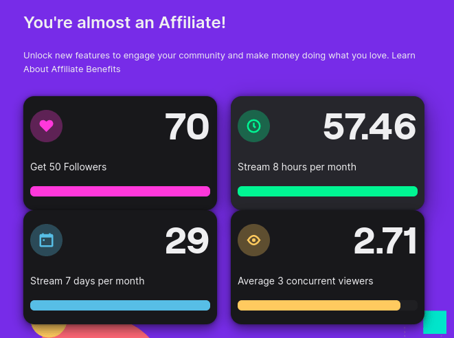 I am making slow and steady process toward Twitch Affiliate status. Here is where I am so far. Once I get that last bar to 3 concurrent viewers, I’ll be promoted and I can’t wait! This week I brought the concurrent viewers number up to 2.71 from 2.4 last week.