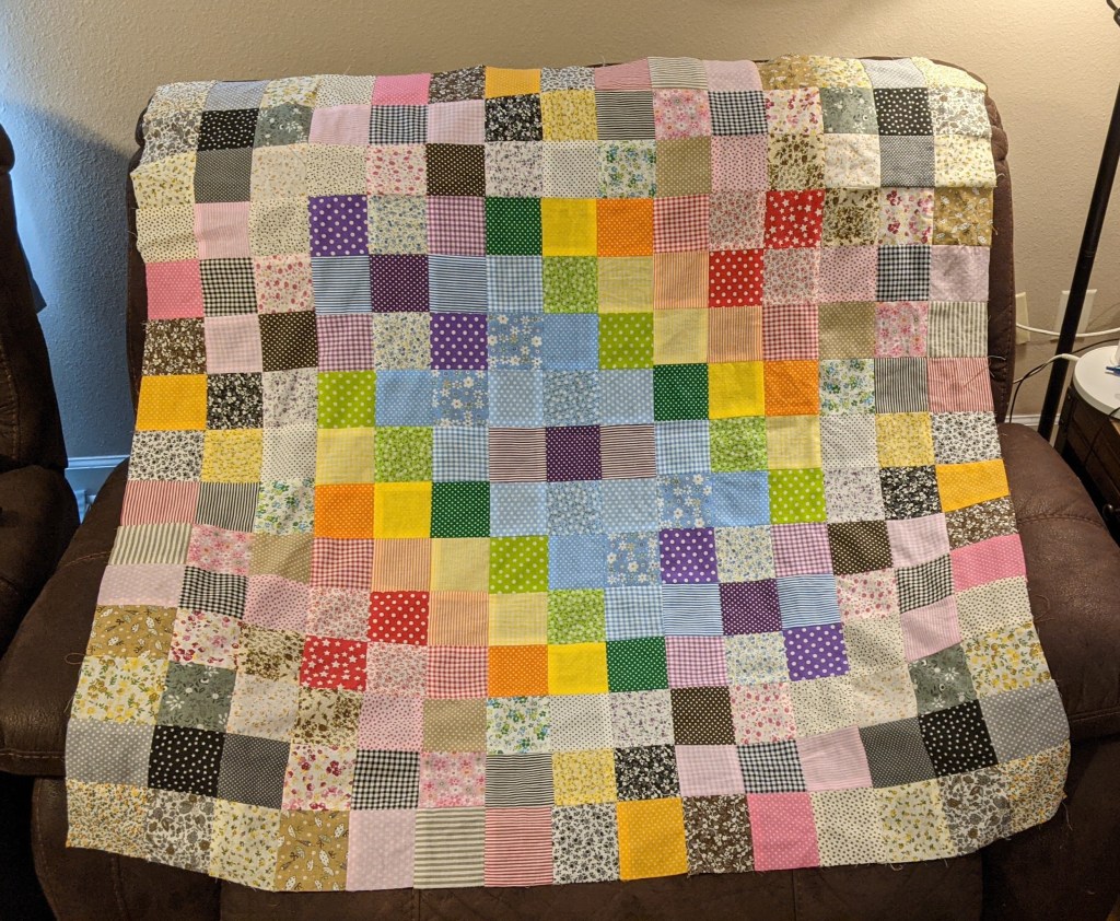 This was made using a $15 pack of random fabric squares purchased on Amazon. I didn’t really plan this out very much, it was meant to re-acclimate myself with using a sewing machine and plotting out the squares.