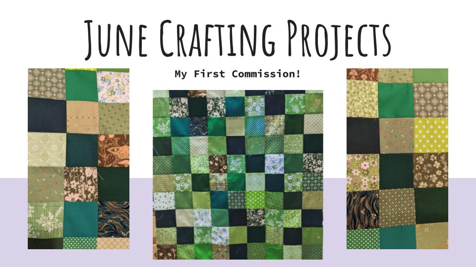 In May I received a request for a custom quilt similar to the rainbow test quilt that I made while I was re-familiarizing myself with sewing in general. The customer requested a green/earth theme, and I am about 40% done with the quilt top as of June 1. My plan is to take it to a long-arm quilter to do the quilting and binding, as I don’t think my sewing machine can tackle the requested full-size blanket.